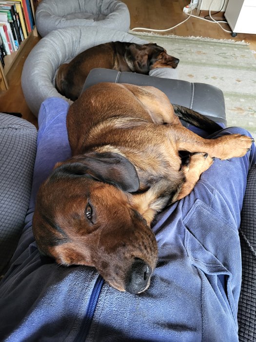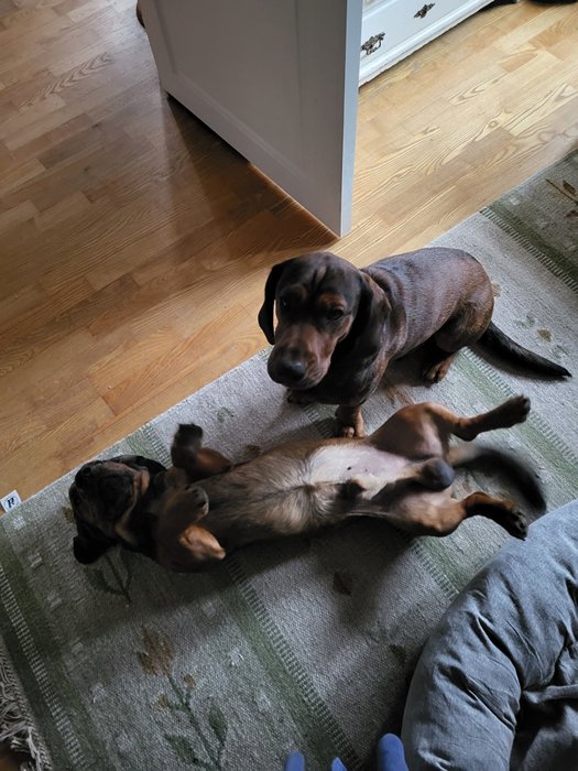 8.30 Möts av dessa goa vovvar när jag kommer ner från sovrummet