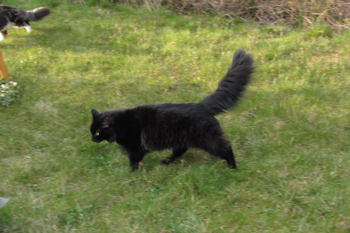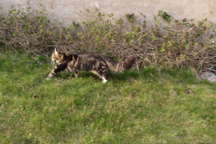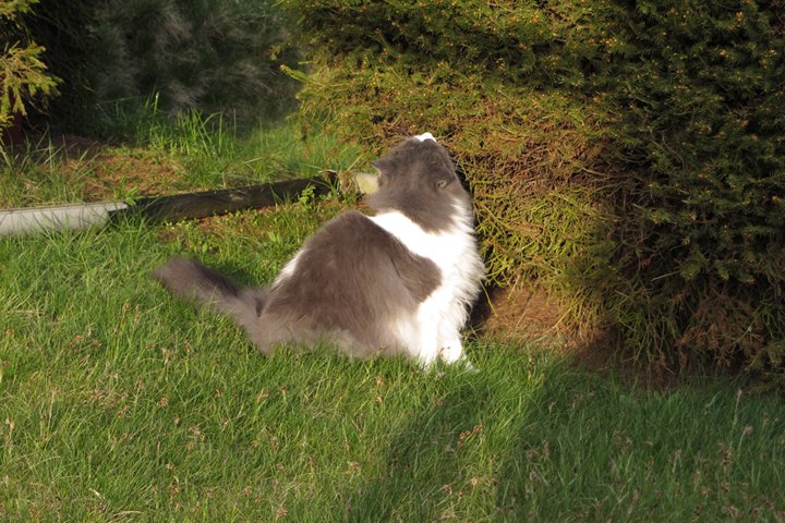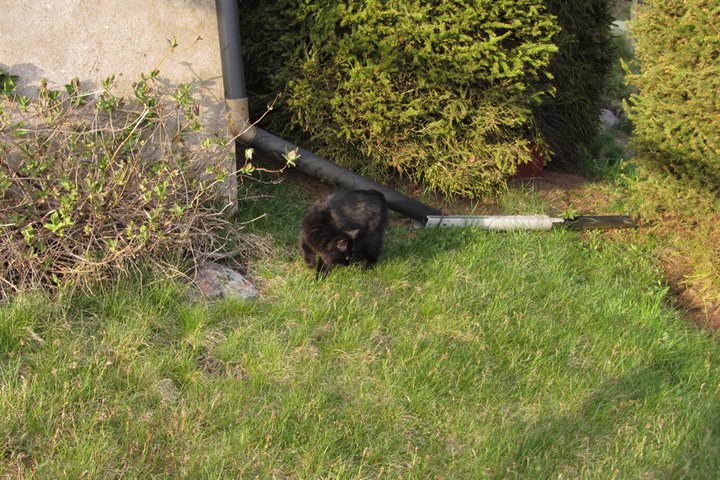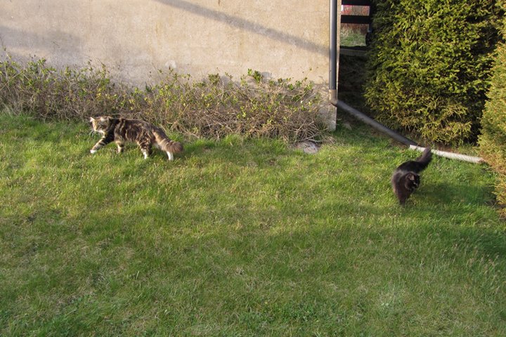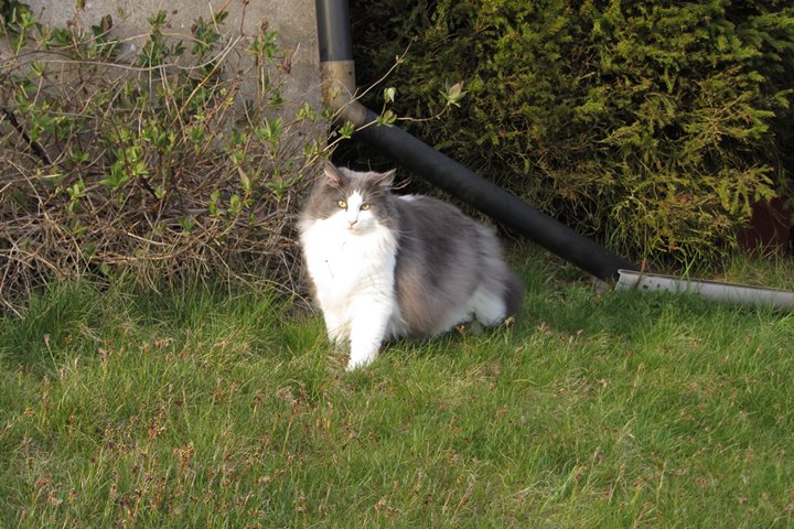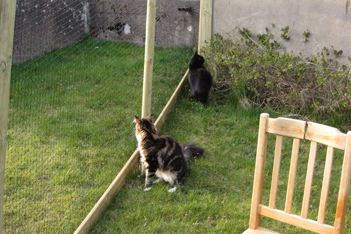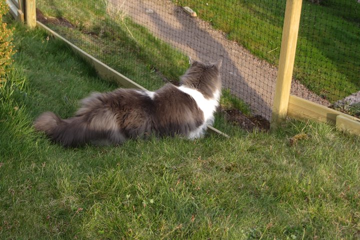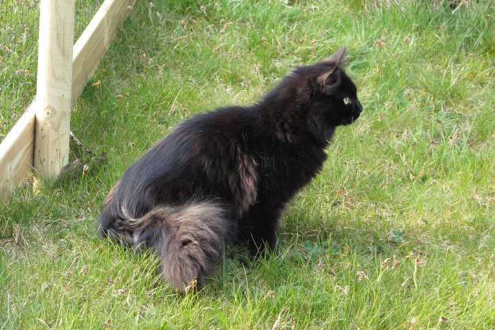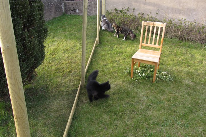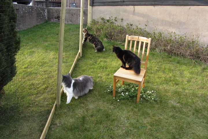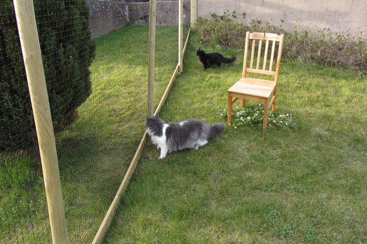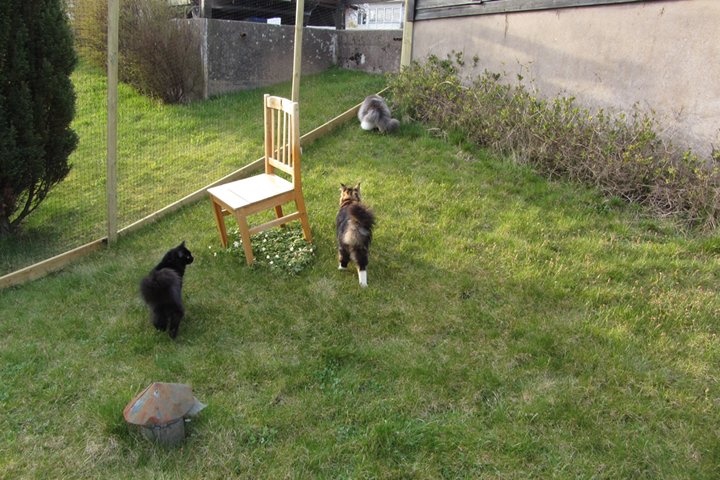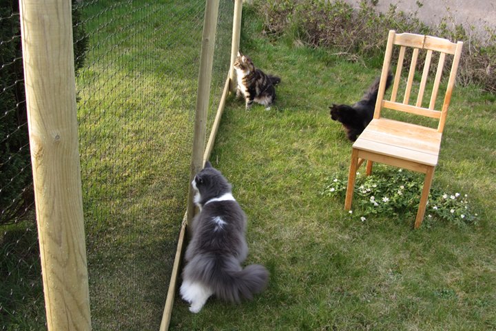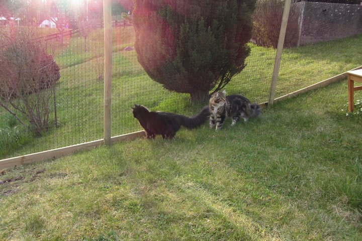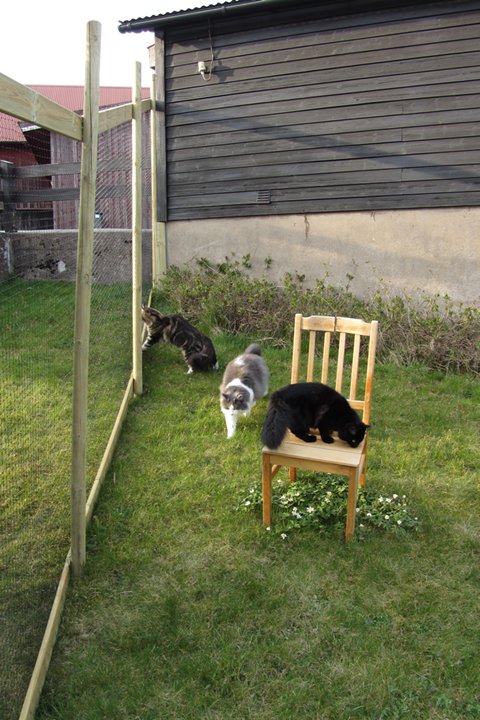 Jag har visst glömt att berätta att kattgården äntligen är inhägnad, så katterna kan komma ut lite då och då. Ännu är det mycket kvar, som att säkra upptill, få in klättermöbler, klätterträd, hyllor, regnskydd etc, men själva inhägnaden är klar med dörr och allting. Kattgården är på c:a 100 m², så de har utrymme att springa på.
