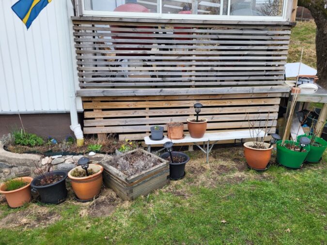 Denna månad är det mer växtlighet och jag har börjat rensa och fixa en del här, samt plockat fram några solcellslampor.