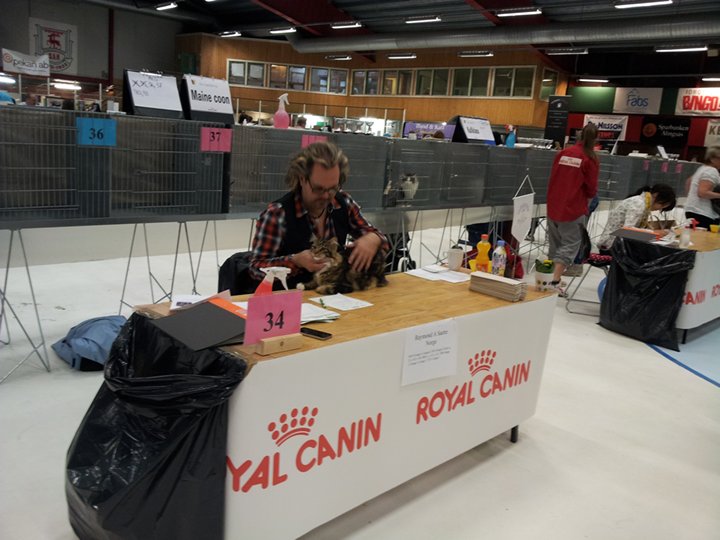 På söndagen var det Raymond Saetre som bedömde Giron, och här var det samma sak med öronens placering och huvudets bredd, men i gengäld älskade Raymond hans look och uttrycket i hans ansikte! Han förklarade att svarta katter lätt ”försvinner” i ansiktet om de inte har en ”look” som fångar betraktarens blick, och den looken hade Giron! Sedan öste han superlativer över hela katten, och både pälsen och presentationen fick SUPER bedömning av honom, kul!